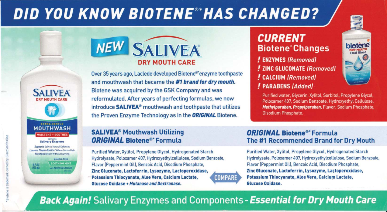 manufactures SALIVEA”: “Biotene was acquired by the GSK Company and was