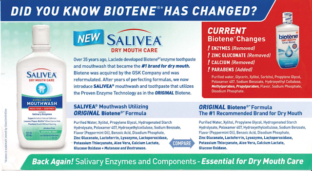 dry mouth. Biotene was acquired by the GSK Company and was reformulated. After