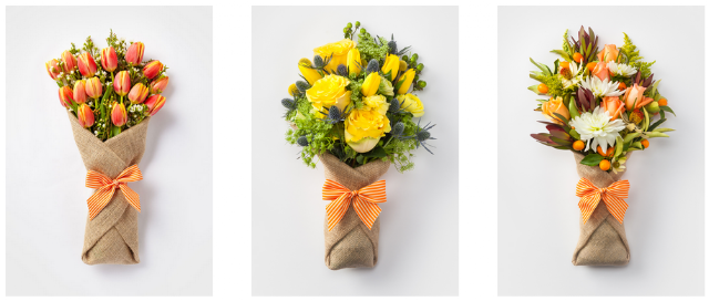 Bloom That is an online flower delivery service that delivers bouquets of flowers in 90 minutes or less. Bloom That launched in San Francisco and set up shop within one mile of Farmgirl’s headquarters and in Farmgirl’s primary sales territory. It initially sold bouquets that had been wrapped in recycled burlap donated by local coffee roasters, then began wrapping its bouquets in new, rather than recycled, burlap. Bloom That also claims to source locally-grown flowers for use in its bouquets and delivers its bouquets via bicycle courier. It first wraps the flowers with a material designed to hydrate the flowers during delivery, than an outer layer of burlap plus its own branding of an orange and white striped ribbon and a paper “luggage” tag fastened with a wooden clothes pin. Bloom that claimed to use burlap because the “hydration pack” was neither aesthetically pleasing nor was it sufficient to hold the flowers together.